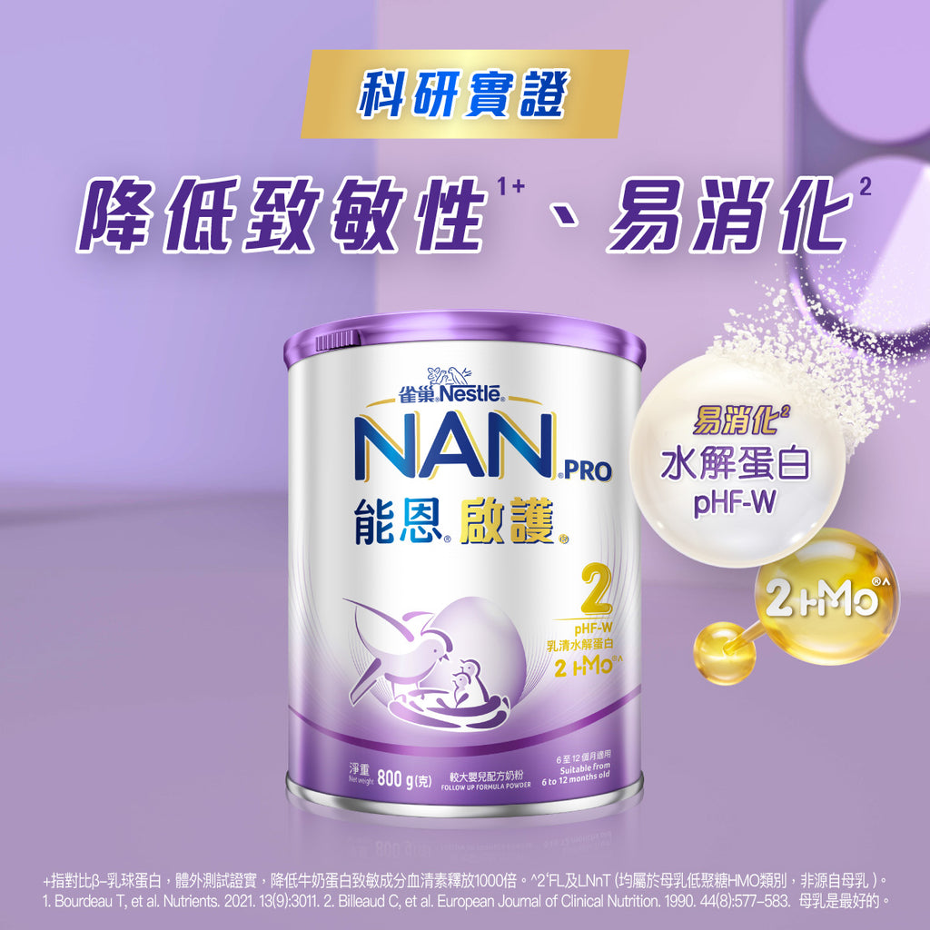 研究指經雀巢®獨特水解技術處理的pHF-W 乳清水解蛋白能降低牛奶蛋白致敏性1000倍 。雀巢® 能恩®啟護®更採用易消化的100% 乳清蛋白,支持寶寶腸道健康。