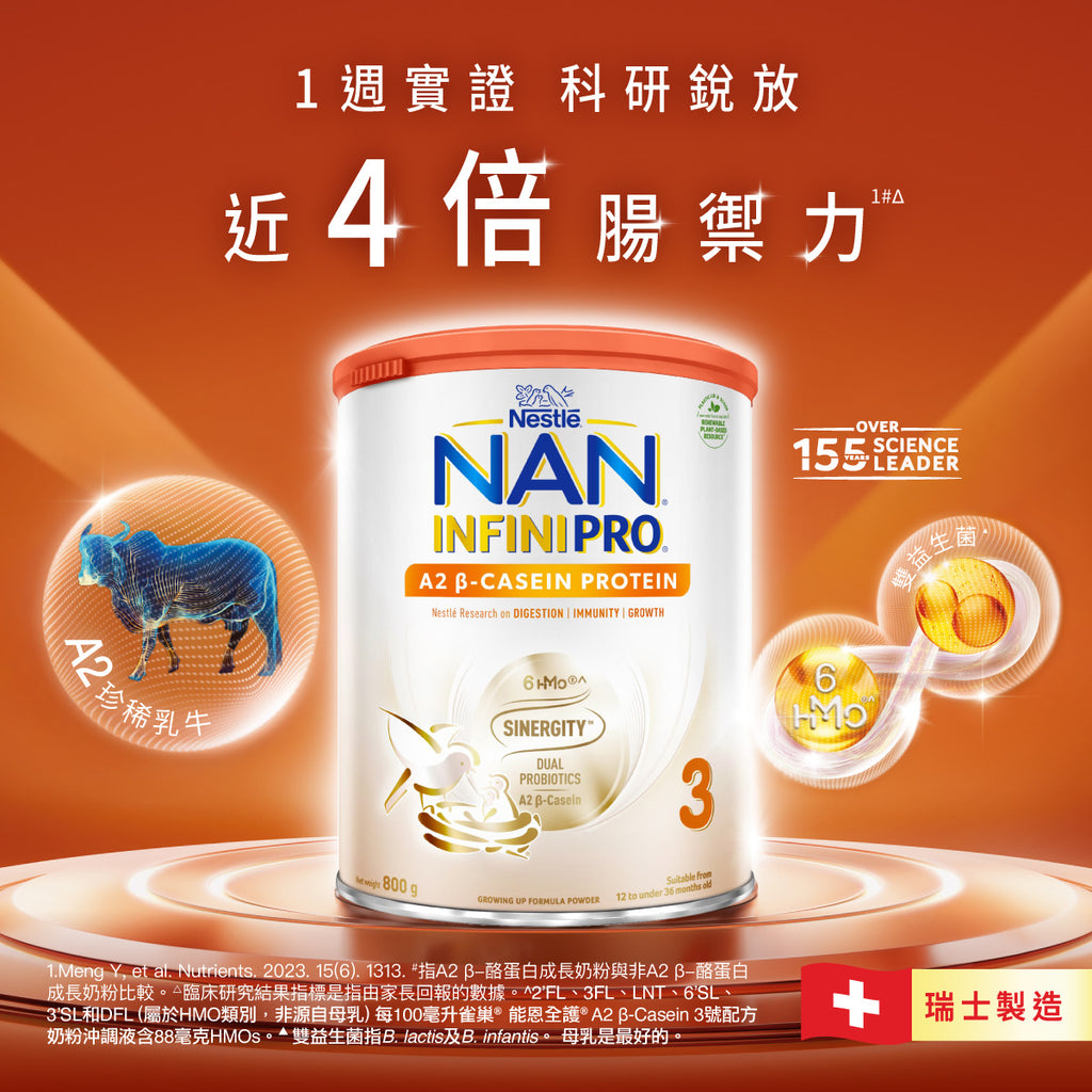 全新雀巢®能恩全護® INFINIPRO® A2 β-Casein珍稀面世, 匯聚百年科研智慧,研發自雀巢®瑞士研究中心。經嚴格的DNA基因檢測,精準鎖定僅有30%的珍稀A2乳牛1。配合革命性「協同昇華技術◇」,雙益生菌加乘6HMOs 2▲ ^,成就全港獨有的A2 β-Casein珍乳組合*,更貼近母源營養**,易於消化吸收,銳放寶寶頂尖腸禦力,延續母源守護。